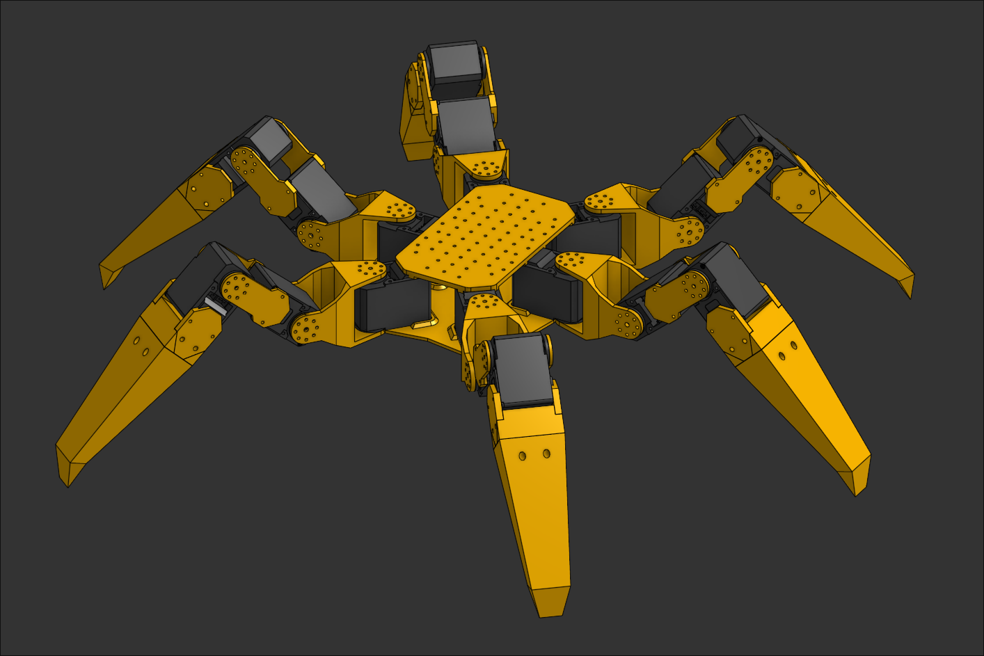 Currently I completed the first iteration of the mechanical design of HARP. I hate printing tricky parts that either require weird printing orientations, that need support material in tiny crevices or on the visible surfaces, screwing up the finish. Standard printing orientations were a priotity to me while designing all of the parts. As of now I only need to optimize the coxa mounting bracket for easy and convenient printing. Unfortunately, I currently don't have an access to my 3D printer and this is basically a version 0.0 of the design, that has arbitrarily chosen mounting hole diamaters without proper countersinks. The model is largely parametrized from the lengths of the limbs, through tolerances for the critical mounting surfaces, ending at the relative positioning and orientation of the servos. The early version will have a perforated mounting plate on top for easier development.