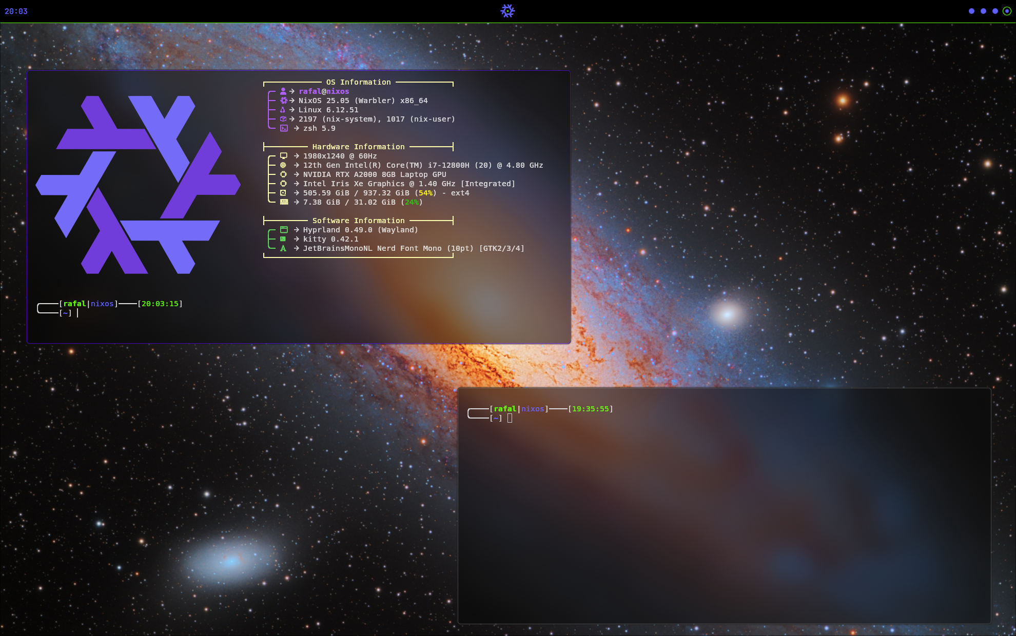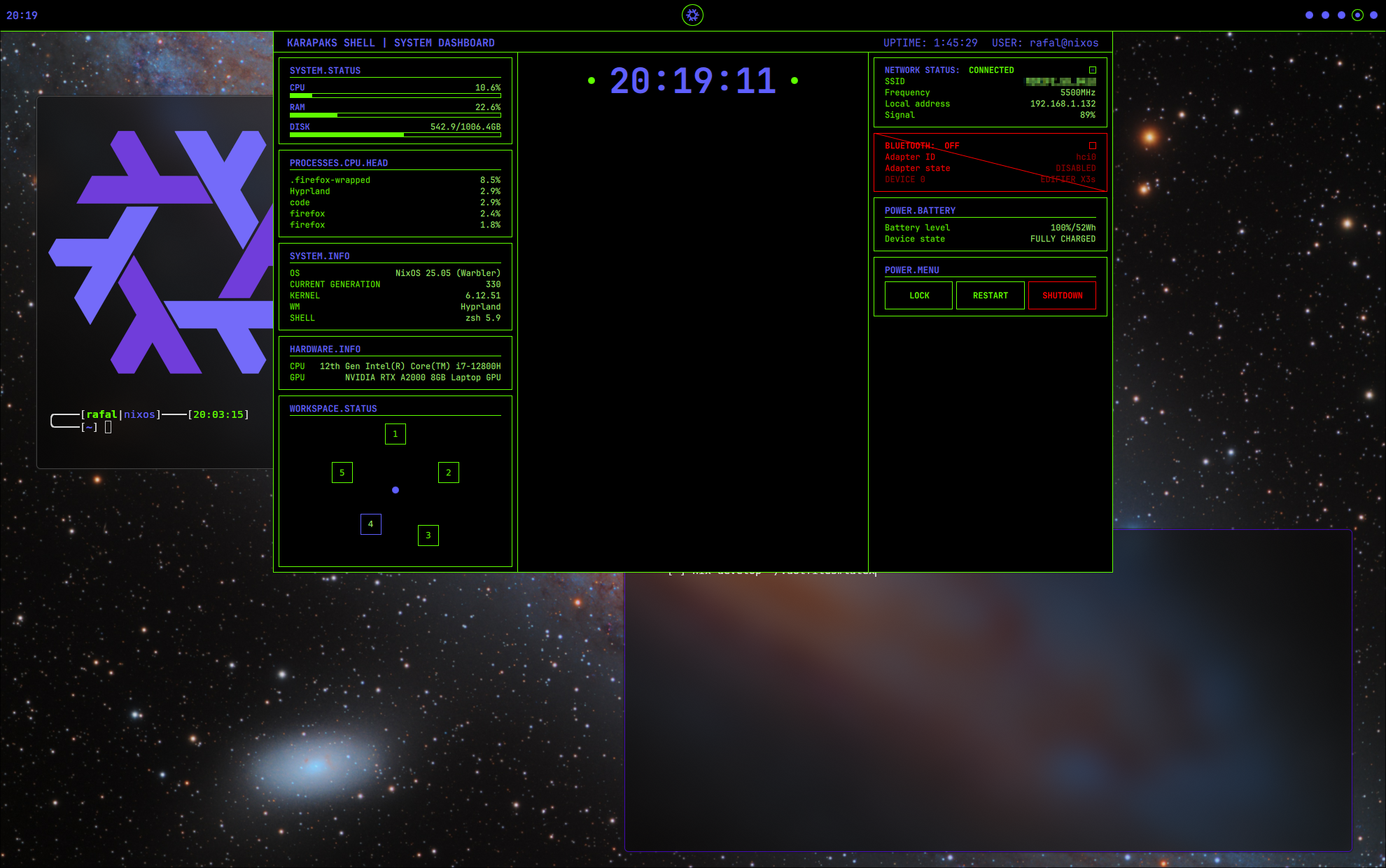 This is supposed to be a dashboard containing a lot of useful information with panels to control features such as the bluetooth adapter, network, VPN and so on. Some widgets such as the workspace tracker are added purely for looks, but in general the dashboard prioritizes functionality. I have already added most of the widgets I really wanted, but there is still a lot of empty space I need to fill out, pending widget ideas.